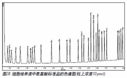 為監(jiān)測(cè)細(xì)胞培養(yǎng)過(guò)程中發(fā)酵液的成分,或者對(duì)發(fā)酵用培養(yǎng)基進(jìn)行質(zhì)量控制,需要分離其它種類的氨基酸。與標(biāo)準(zhǔn)分析方法相比,分析細(xì)胞培養(yǎng)液中的氨基酸在分析方法的參數(shù)設(shè)置上有些不同: AccQ•Tag Ultra 洗脫劑 A (濃縮液)的稀釋倍數(shù)不同,還需要較高的柱溫。其它參數(shù)相同。