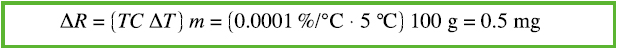 如果您在XP/XS分析天平上對100g的加載值(樣品質(zhì)量)進(jìn)行稱量,并且實(shí)驗(yàn)室的環(huán)境溫度自上一次校準(zhǔn)之后變化5˚C,則在最差的情況下可得出以下最大結(jié)果變化值ΔR(XP的溫度系數(shù)為0.0001%/ ˚C):
