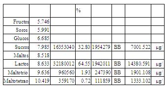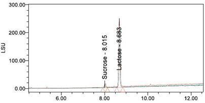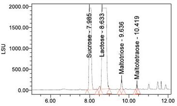 圖 11. 奶 粉提取 樣品色譜圖及結(jié) 果數(shù)據(jù)由圖 11 和 12 的數(shù)據(jù)可以知道此奶粉中含有蔗糖 16.8mg/g 、乳糖140.1 mg/g 、麥芽三糖和麥芽四糖的含量分別只有 1.9 mg/g 、 1.3 mg/g 。某液態(tài)奶提取后,稀釋 100 倍檢測(cè)結(jié)果見(jiàn)圖 13 。