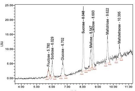 圖 1 是八種糖 50ppm 混合標(biāo)準(zhǔn)品用 UPLC(ACQUITY UPLC BEH Amide色譜柱) 分離, E LSD 檢測(cè)的色譜圖,按照保留時(shí)間順序分別是: Fructo se( 果糖 ) 、 Sorbose( 山梨糖 ) 、 Glucose( 葡萄糖 ) 、 Sucrose( 蔗糖 ) 、 Malto se( 麥芽糖 ) 、 Lacto se( 乳糖 ) 、 Maltotriose( 麥芽三糖 ) 、 Maltotetraose( 麥芽四糖 ) ;包括 5 種單糖和 3 種多糖。有關(guān)數(shù)據(jù)見(jiàn)下表。