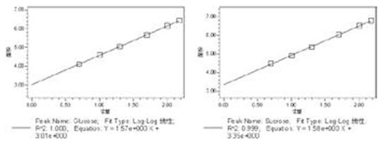 濃度分別為 5.0 00 、 10.000 、 20.000 、 50.000 、 10 0.000 、 150.000mg/L 的八種 糖標(biāo)準(zhǔn)品依 次進(jìn)樣,進(jìn)樣量均為 5µ L ,外標(biāo)法定量。以峰面積 A 的 lg 值 為縱坐標(biāo),濃度 C 的 lg 值為橫坐標(biāo)進(jìn)行線(xiàn)性回歸,得到 8 種糖的線(xiàn)性方程、復(fù)相關(guān)系數(shù)和線(xiàn)性曲線(xiàn)圖如圖 3- 圖 10 所示,在 5.000-150.000 mg/L 范圍 8 種糖均具有良好的 lg-lg 線(xiàn)性關(guān)系。