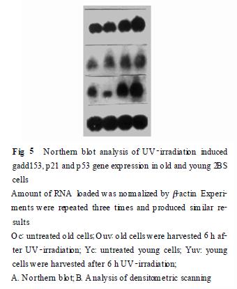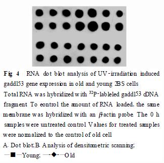 214 斑點(diǎn)及Northern 印跡雜交結(jié)果分析 由斑點(diǎn)雜交結(jié)果可見, 紫外線照射6 h 后gadd 153 表達(dá)達(dá)峰值, 衰老細(xì)胞的gadd 153 可誘導(dǎo)性明顯低于年輕細(xì)胞, 結(jié)果見(Fig. 4). 根據(jù)斑點(diǎn)雜交結(jié)果選取紫外線照射后6 h 收集細(xì)胞, 進(jìn)行Northern 雜交, 結(jié)果顯示(Fig. 5) , 紫外線照射后衰老細(xì)胞中g(shù)add153、p 53、p 21 基因的可誘導(dǎo)性均明顯低于年輕細(xì)胞, 但其中p 53 誘導(dǎo)性改變最小. 另外, 這三種基因在紫外線損傷前的基本表達(dá)在衰老細(xì)胞及年輕細(xì)胞中也有所不同, 其中p 21 在衰老細(xì)胞中的基本表達(dá)明顯高于年輕細(xì)胞, gadd153 的表達(dá)在衰老細(xì)胞中似略高于年輕細(xì)胞, 而p53 的表達(dá)差異不顯著.