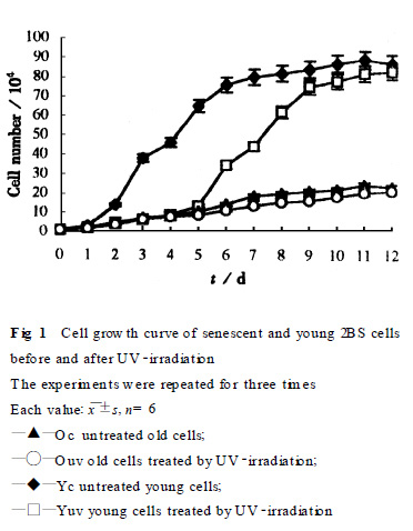 2.1 細(xì)胞形態(tài)及增殖特性的比較 紫外線照射前可見衰老2BS細(xì)胞形態(tài)與年輕細(xì)胞明顯不同, 衰老細(xì)胞胞體肥大、胞漿內(nèi)顆粒增多、胞漿混濁、折光性下降、細(xì)胞排列極不規(guī)則; 而年輕細(xì)胞則胞體細(xì)長、胞漿清亮、細(xì)胞呈漩渦狀排列. 紫外線照射后, 衰老細(xì)胞形態(tài)變化不十分明顯, 僅見胞漿內(nèi)顆粒略顯增加; 而年輕細(xì)胞則可見胞漿顆粒明顯增多、胞漿透明度下降、胞體也略顯增大, 但培養(yǎng)約1周后細(xì)胞形態(tài)基本恢復(fù)正常. 紫外線照射前后細(xì)胞生長曲線見Fig.1, 經(jīng)紫外線照射后年輕細(xì)胞增殖速率受到明顯抑制, 但約6d后增殖能力恢復(fù)正常; 衰老細(xì)胞增殖速率明顯低于年輕細(xì)胞, 紫外線照射前后增殖變化不十分明顯。