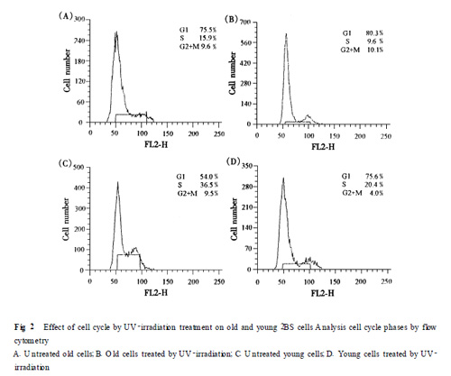 1.4 細(xì)胞周期分析 紫外線照射劑量、時(shí)間同上,37℃溫育24h后胰酶消化, 收集細(xì)胞, 再用RNA 酶于37℃消化1h, 然后用碘化丙啶(PI)染色, 以Bec2ton2Dickinson 流式細(xì)胞儀進(jìn)行FACScan(fluo res2cence act ivated cell sorting)分析, 以未進(jìn)行紫外線照射的衰老及年輕細(xì)胞作對(duì)照。