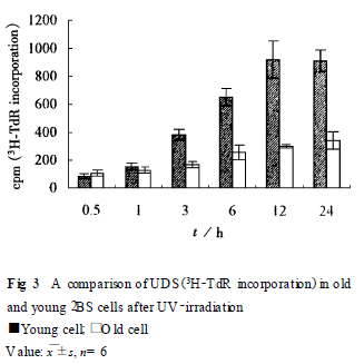 213 DNA 修復(fù)能力比較 以3H2TdR 參入法測(cè)定非程序性DNA 合成(UDS) , 以表示DNA 總修復(fù)能力. 從F ig. 3 可見, 在紫外線照射后12 h 左右UDS達(dá)峰值. 衰老2BS 細(xì)胞的修復(fù)能力明顯低于年輕細(xì)胞(P < 0101).