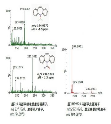 最后,通過和卡馬西平標(biāo)準(zhǔn)溶劑進(jìn)行對比,確定了結(jié)果。如圖 3 所示,溶劑標(biāo)準(zhǔn)數(shù)據(jù)與非標(biāo)靶污染物數(shù)據(jù)相匹配,這明確說明該非預(yù)期化合物為卡馬西平。
