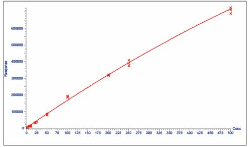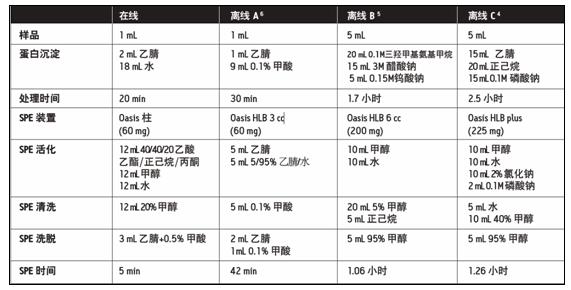 圖 4 為紅霉素濃度從 1.0ppb 到 500.0ppb 、線性系數(shù)為 0.9902 的校正曲線圖。表 2 是在線和離線 SPE 萃取方案肩并肩的對(duì)比,從文獻(xiàn)到處理天然的牛奶樣品到適于 LC/MS 或 GC/MS 分析的理想形態(tài)。當(dāng)評(píng)價(jià)在線 SPE/LC/MS/MS 和離線方案時(shí),通常的萃取程序和溶劑、實(shí)驗(yàn)室人員和時(shí)間的整體應(yīng)用都是很重要的。其它的食品樣品有各種各樣的結(jié)構(gòu),在 SPE 萃取前可能需要其它的處理程序。例如,牛奶樣品在用 SPE 裝置進(jìn)一步凈化前需要簡(jiǎn)單的蛋白沉淀和離心。對(duì)于像