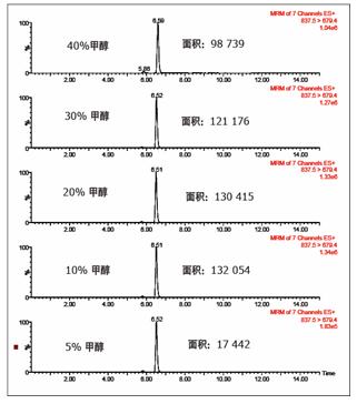 圖 2 為添加了 0.5ppb 每種抗生素的牛奶樣品的具有代表性的提取離子色譜圖?股卦谖⒘克蕉季哂辛己玫男盘(hào)和峰形。對(duì)于食品樣品,樣品的復(fù)雜度要高于飲用水樣品,而且清洗步驟需要優(yōu)化以最大程度的清除干擾物質(zhì),而不洗脫掉所感興趣的分析物。圖 3 為添加了 100ppb 紅霉素,分別用 5% 、 10% 、 20% 、 30% 和 40% 甲醇清洗的色譜圖。在圖 2 中, 20% 甲醇清洗與 5% 甲醇清洗相比,會(huì)產(chǎn)生更高的信號(hào)。 5% 甲醇的弱信號(hào)可歸因于離子抑制效應(yīng)。可是,當(dāng)清洗步驟中的有機(jī)相比例增加的過(guò)多時(shí),信號(hào)的靈敏度由于部分洗脫而有下降趨勢(shì)。