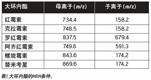 大環(huán)內(nèi)酯所用的 MRM 條件都列在了表 1 中。使用的 SPE 萃取柱是 Waters® Oasia HLB 2.1x 20 mm , 25 μ m ,中性 pH 值上樣,流動(dòng)相(無(wú)添加物 ) )。使用的分析柱是 XBridgeTMC18 2.1x 50 mm 3.5 μ m ,低 pH 值流動(dòng)相洗脫。清洗和再活化參數(shù)都列在了下面。