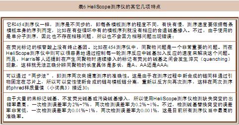 HeliScope測序儀是由Quake團隊設(shè)計開發(fā)的,它實際上也是一種循環(huán)芯片測序設(shè)備。不過,HeliScope測序儀最大的特點是無需對測序模板進行擴增,它使用了一種高靈敏度的熒光探測儀直接對單鏈DNA模板進行合成法測序。首先,將基因組DNA切割成隨機的小片段DNA分子,并且在每個 片段末端加上poly-A尾。然后通過poly-A尾和固定在芯片上的poly-T雜交,將待測模板固定到芯片上,制成測序芯片。最后借助聚合酶將熒光標(biāo) 記的單核苷酸摻入到引物上(圖6d)。采集熒光信號,切除熒光標(biāo)記基團,進行下一輪測序反應(yīng),如此反復(fù),最終獲得完整的序列信息。根據(jù)最近的報道,經(jīng)過數(shù) 百輪這種單堿基延伸可以獲得25bp或更長的測序長度。HeliScope測序儀的其它特點見表6。