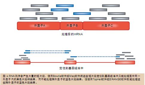 要將RNA的逆轉(zhuǎn)錄片段cDNA重新定位到基因組當(dāng)中需要更加復(fù)雜的專業(yè)化算法。要將不同外顯子經(jīng)過剪切拼接之后生成的RNA短片段重新定位到基因組中和將一個外顯子生成的RNA短片段重新定位到基因組中是完全不一樣的(圖14)。