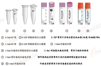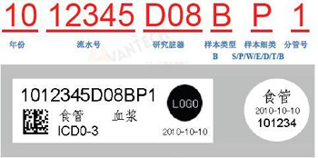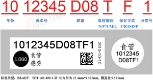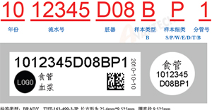 C.標(biāo)簽說(shuō)明:以上方案設(shè)計(jì)中,條碼打印機(jī)和標(biāo)簽使用美國(guó)的BRADY 產(chǎn)品,標(biāo)簽建議使用THT-163-499,該標(biāo)簽可以適用-196 度。標(biāo)簽長(zhǎng)方部分可打印條形碼和編號(hào),單位logo,以及若干條樣本的信息項(xiàng)(如臟器名稱,ICDO-3 編號(hào),樣本類型,采集日期等),可貼于凍存管和離心管的側(cè)壁,標(biāo)簽的圓點(diǎn)部分可以打印流水號(hào)、臟器名稱和采集日期,可貼于凍存管和離心管的頂蓋部分,以便于核對(duì)。編號(hào)規(guī)則,參見(jiàn)附表2 或訪問(wèn)www.avantech.cn/code.pdf
