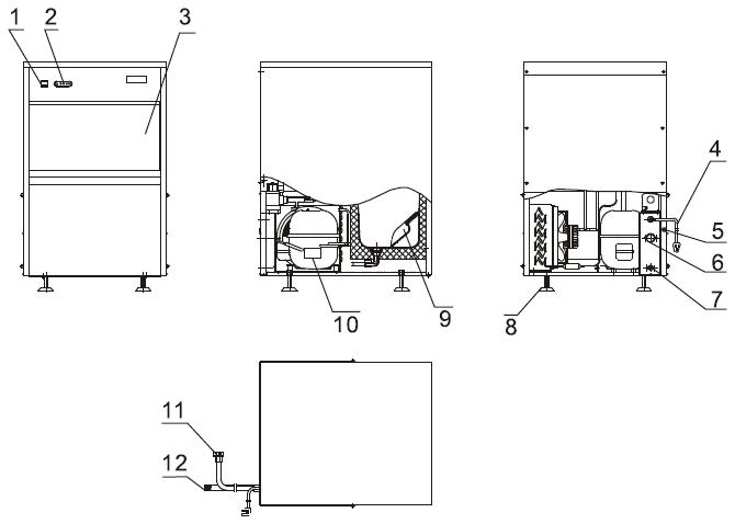 2.制冰機(jī)初次使用或長期停機(jī)后再次使用,應(yīng)將排水螺母5擰開,并自備容器放于盛水位置,前兩次制冰為制冰機(jī)管路系統(tǒng)的清潔過程,所制冰塊不宜食用,等兩次排水放完,擰好排水螺母5,再制冰塊即可食用。