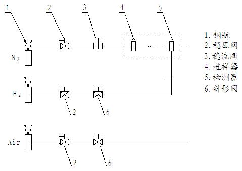 (5)調(diào)節(jié)載氣穩(wěn)流閥,使載氣流量調(diào)節(jié)適當(dāng),保證載氣瓶總壓力在50kg/cm2~150kg/cm2