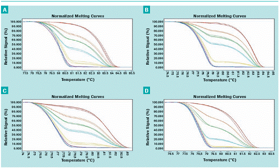 對(duì)標(biāo)準(zhǔn)稀釋品進(jìn)行檢測(cè),測(cè)定HRM檢測(cè)的靈敏性。通過(guò)所有HRM檢測(cè)(APC、MGMT、GSPT1和PTEN),我們可以在保證重現(xiàn)性的基礎(chǔ)上,于非甲基化DNA背景中,檢測(cè)到1% 的甲基化的DNA(圖1A-D)。