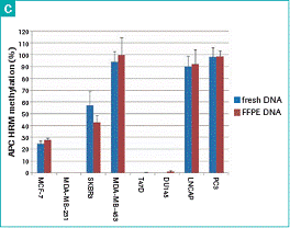 下一步,我們對(duì)福爾馬林固定、是蠟包埋處理對(duì)啟動(dòng)子高度甲基化檢測(cè)的作用進(jìn)行了評(píng)價(jià)。我們能夠?qū)?APC啟動(dòng)子高度甲基化進(jìn)行檢測(cè),檢測(cè)可靠性較高。圖2(A–C)顯示,新鮮與FFPE細(xì)胞系DNA APC HRM檢測(cè)重現(xiàn)性與一致性較近似。