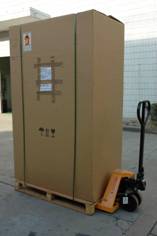 當(dāng)室內(nèi)高度不足以運(yùn)輸時(shí),可卸掉產(chǎn)品木托盤(pán),并卸下產(chǎn)品外包裝拍扁,墊在柜底,依據(jù)以下步驟操作