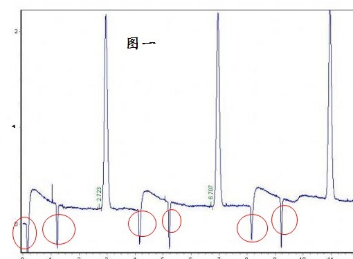 我在一家食品廠工作,我們的產(chǎn)品主要用來出口,所以對(duì)質(zhì)量的要求非常嚴(yán)格。我們是用液相色譜儀(示差檢測(cè)器)做麥芽糖的含量檢測(cè),用注射用水檢查系統(tǒng)的時(shí)候每次都會(huì)出現(xiàn)負(fù)峰,這也就是我們最頭痛的時(shí)候,原來用的是某個(gè)品牌(這里就不指名道姓了)的色譜工作站。這個(gè)工作站我翻來覆去的找(怕有些功能我還熟悉),最后還是沒有找到處理負(fù)峰的功能。但是我的譜圖都負(fù)峰是很多,不計(jì)算的話出來結(jié)果是不符合標(biāo)準(zhǔn)的。圖一般是這種的(請(qǐng)見圖一)