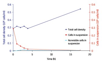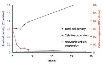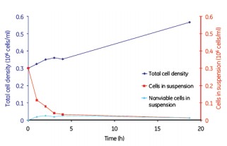 · 本研究獲得最大細(xì)胞密度為3×106細(xì)胞/ml,這與使用轉(zhuǎn)瓶在類似的生長條件下所獲得