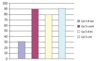 圖 11.無血清(sf)和含血清(s)培養(yǎng)基對(duì) Vero 細(xì)胞貼附到 Cytodex 3微載體的影響。在貼壁階段,分別采用連續(xù)搖動(dòng)(cont)和間歇搖動(dòng)(int)的混合方式。接種后24 h 的細(xì)胞在微載體上的貼壁情況如圖所示。