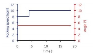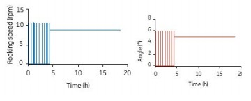 圖 4.在10 L Cellbag中前4 h內(nèi),每30 min間歇混合2 min (12 rpm和6º) ,4h后采用連續(xù)搖動(dòng)(10rpm和 5º)