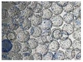 透明的 Cytodex 微載體可以不經(jīng)染色直接鏡檢,使用臺(tái)盼藍(lán)染色可以快速觀察細(xì)胞是否達(dá)到交匯(圖 16);罴(xì)胞完整的細(xì)胞膜將會(huì)阻斷臺(tái)盼藍(lán)染料,并阻止微載體被染色。無細(xì)胞覆蓋的微載體很容易被染色,因此可以方便的看到細(xì)胞層中的缺陷或空洞。