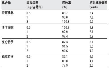 表4. 采用安捷倫SampliQ SCX 進行固相萃取豬肉中β2-激動劑的回收率和重現(xiàn)性;(部件號: 5982-3236), 平均回收率90%,平均相對標準偏差4.4%