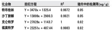 本應用報告開發(fā)并驗證了一種同時檢測四種β2-激動劑殘留物的方法,包括特布他林、 沙丁胺醇、克侖特羅和福莫特羅。分析物經過液-液萃取(LLE)和固相萃取(SPE)純化后, 由正離子多反應監(jiān)測模式下的液相色譜耦合電噴霧串聯(lián)質譜(LC-ESI-MS/MS)進行定量。