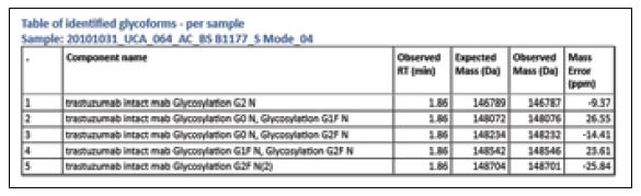 圖 2. 圖-1中右下角表格的放大視圖,該表列出了完整單克隆抗體(mAb)的質(zhì)量測定結(jié)果和精確指定的mAb不同糖型。