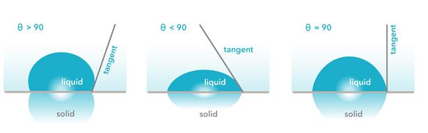 It can be seen from this figure that a low values of contact angle (θ) indicates that the liquid spreads, or wets well, while a high contact angle indicates poor wetting. If the angle θ is less than 90 degrees the liquid is said to wet the solid. If it is greater than 90 degrees it is said to be non-wetting. A zero contact angle represents complete wetting.