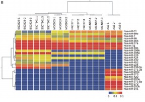 圖 1:microRNA 芯片結(jié)果聚類圖。隨著耐受性的增強,13個 microRNA表達量增強,12個 microRNA表達量降低。 |