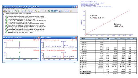 該數(shù)據(jù)表明與Xevo TQ分析結(jié)果具有良好的一致性。圖8給出了一個示例,化合物L(fēng)-脯氨酸在細胞萃取物中被明確鑒別出來,并在4個數(shù)量級中表現(xiàn)出線性的動態(tài)范圍響應(yīng),RMS質(zhì)量誤差為0.57mDa。