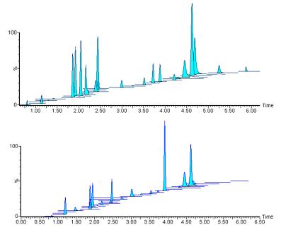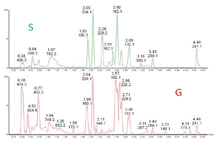 圖7. 全掃描色譜圖比較。通過UPLC-Synapt G2獲取的S和G細胞萃取物的數(shù)據(jù)。