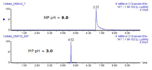 圖3. 比較不同pH下,包含約2µg/mL L-賴氨酸溶液的兩幅MRM色譜圖