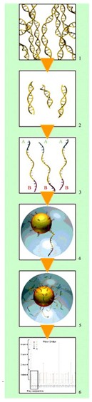 GS FLX系統(tǒng)減少了傳統(tǒng)測序樣品制備過程中對大型自動站的依賴,完全不需要進行繁瑣的建庫過程,也不必進行克隆挑取、微孔板處理等工作,利用創(chuàng)新的磁珠和emPCR技術進行樣品制備,同時提供完整的后續(xù)生物信息學分析解決方案。 1) 樣品種類:GS FLX系統(tǒng)支持各種不同來源的樣品序列測定,包括基因組DNA,PCR產(chǎn)物,BACs,cDNA及小分子RNA等,不同類型的樣品測序都可在一臺儀器上完成。 2) 樣品DNA打斷:樣品如基因組DNA或BAC等被打斷成300-800bp的片段;對于小分子的非編碼RNA,這一步驟并不需要。短的PCR產(chǎn)物則可利用GS融合引物擴增后直接進行步驟4)。 3) 加接頭:借助一系列標準的分子生物學技術,將3′端和5′端有特異性的A和B接頭連接到DNA片段上。接頭也將在后繼的純化,擴增和測序步驟中用到。圖中僅僅顯示了后續(xù)步驟中要用到的單鏈的DNA片段。 4) 一條DNA片段=一個磁珠:接頭使成百上千條DNA片段分別結合到一個磁珠上,磁珠被單個油水混合小滴包被后,在這個小滴里進行獨立的擴增,而沒有其他的競爭性或者污染性序列的影響;所有DNA片段進行平行擴增(emPCR)。 5) 一個磁珠=一條讀長:經(jīng)過emPCR擴增后,每個磁珠上的DNA片段擁有了成千上萬個相同的拷貝。經(jīng)過富集以后,這些片段仍然和磁珠結合在一起,隨后就可以放入到Pico Titer Plate板中供后繼測序使用了。 6) 數(shù)據(jù)讀取和分析工具:GS FLX 系統(tǒng)提供三種不同的生物信息學工具對測序數(shù)據(jù)進行分析,適用于不同的應用。例如多達3GB序列的重測序,對比已知參考序列進行的擴增產(chǎn)物差異分析及 120MB的從頭測序工作等。 |