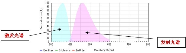 上圖為Olympus U-FUW激發(fā)塊的光譜信息。我們可以了解到此激發(fā)塊可以提供的激發(fā)光波長在300-400nm之間,剛好可以激發(fā)DAPI。允許透過的熒光光譜范圍也在410nm以上,所以此激發(fā)塊可以用來實(shí)現(xiàn)DAPI熒光染料的觀察。