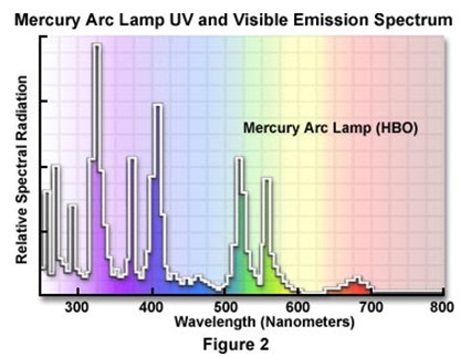 以下提供普通熒光顯微鏡常用的汞燈和氙燈光源的圖譜,供大家參考。