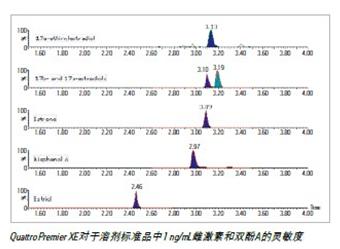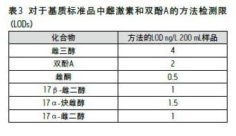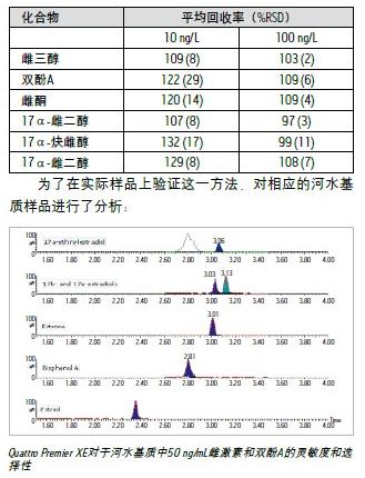 Quattro Premier XE對于河水基質(zhì)中50 ng/mL雌激素和雙酚A的靈敏度和選擇性。通過計(jì)算得出了該方法的檢測限(LOD),表明它足以監(jiān)測實(shí)際的地表水樣品。必要時,還可以通過增加所萃取水的容量來使這些值更優(yōu)化: