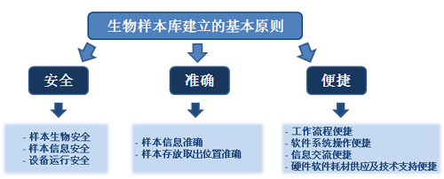 建樣本庫的基本原則是安全、準(zhǔn)確、便捷。其中安全包括樣本生物安全、樣本信息安全、設(shè)備運(yùn)行安全;準(zhǔn)確包括樣本信息準(zhǔn)確、樣本存放取出位置準(zhǔn)確;便捷包括工作流程便捷、軟件系統(tǒng)操作便捷、信息交流便捷、硬件軟件耗材供應(yīng)及技術(shù)支持便捷。