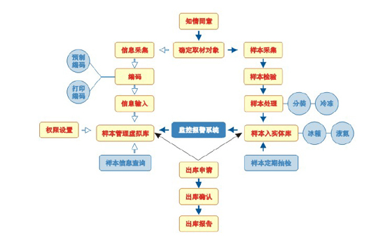樣本庫通常由基礎(chǔ)設(shè)施、凍存設(shè)備、凍存耗材、編碼及讀碼設(shè)備、監(jiān)控設(shè)備、管理軟件和人員配置構(gòu)成。合理的架構(gòu)及流程可以保證樣本庫運(yùn)行安全、準(zhǔn)確、便捷。常規(guī)生物樣本庫工作流程圖舉例如下: