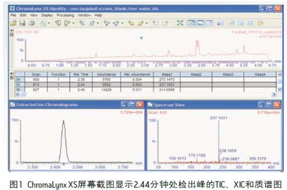 Waters® Xevo™ G2 QTof連同ACQUITY UPLC®和ChromaLynxTMXS數(shù)據(jù)處理軟件用于快速篩查經(jīng)Oasis® HLB柱萃取后的天然河水。該方案使用一種總運(yùn)行時(shí)間為五分鐘的UPLC®通用篩查梯度。所用的流動(dòng)相為10 mM醋酸銨水溶液和10mM的醋酸銨甲醇溶液。對河水空白基質(zhì)進(jìn)行了篩查,以研究可能存在的任何本底污染。經(jīng)ChromaLynx XS軟件去卷積后,在2.44分鐘處發(fā)現(xiàn)了離子m/z 237.1031的一個(gè)明顯色譜峰,如圖1所示。