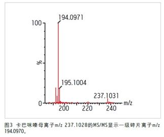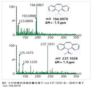 最后,通過與純卡巴咪嗪的溶劑標(biāo)準(zhǔn)溶液比較而得到了明確確認(rèn)。圖3所示的溶劑標(biāo)準(zhǔn)品數(shù)據(jù)與非目標(biāo)污染物數(shù)據(jù)建立了一個(gè)匹配,從而清晰地證明了這種非預(yù)期化合物就是卡巴咪嗪。