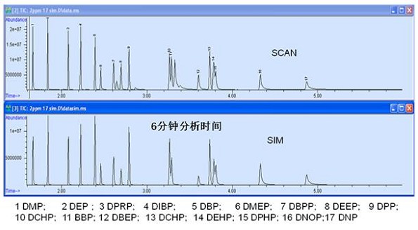 利用5975T LTM GCMS儀器系統(tǒng)LTM專利技術(shù)的色譜柱快速升降溫優(yōu)勢,圖2為以5倍國標(biāo)GB/T 21911-2008方法的速度分析17種增塑劑2ppm混標(biāo)SCAN和SIM的譜圖,極大地提高了GC/MS儀器分析食品飲料中17種增塑劑的速度。