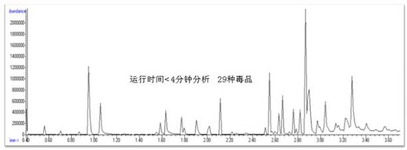 應(yīng)用安捷倫熱分離進(jìn)樣桿可以不作樣品處理或在簡單的樣品前處理之后進(jìn)樣,5975T可以對29種毒品進(jìn)行檢測,運(yùn)行時間只有4分鐘不到。如圖6所示。