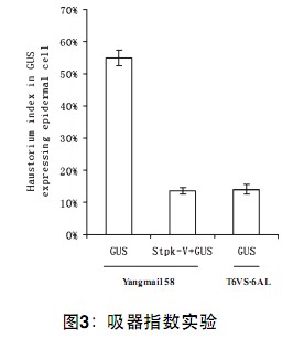 如圖所示。Yangmai158小麥是Bgt敏感型,易位系小麥T6VS-6AL則具有Bgt抗性。當Yangmai158瞬時表達對照基因GUS時,吸器指數(shù)高達54.8%;而Yangmai158瞬時表達GUS+Stpk-V時,吸器指數(shù)降低到13.6%。T6VS-6AL瞬時表達GUS,吸器指數(shù)為14.1%。這一結(jié)果表明,瞬時表達Stpk-V會抑制Bgt的生長。