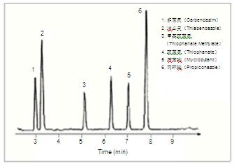 苯并咪唑類(lèi)(Benzimidazoles),如涕必靈(Thiabendazole),是常規(guī)用于保護(hù)水果以及蔬菜的殺真菌劑。但是對(duì)這些物質(zhì)進(jìn)行液相分析通常比較麻煩。例如,涕必靈,在大多數(shù)反相硅膠色譜柱上,會(huì)顯示出明顯的拖尾,特別是當(dāng)分析在酸性pH條件下進(jìn)行時(shí)。涕必靈和多菌靈(Carbendazim)用pH 10條件在沃特世雜化顆粒技術(shù)色譜柱如XTerra ® MS C 18柱上會(huì)得到很好的保留和峰形;但是高pH條件不適合于其他種類(lèi)的殺真菌劑組分的同時(shí)檢測(cè),例如,硫菌靈 (Thiophanate)和甲基硫菌靈(Thiophanate Methylate),它們是氨基甲酸酯類(lèi)殺真菌劑,在高pH流動(dòng)相中不穩(wěn)定,如使用高pH條件進(jìn)行檢測(cè)時(shí)將被漏檢或檢測(cè)濃度不準(zhǔn)確。