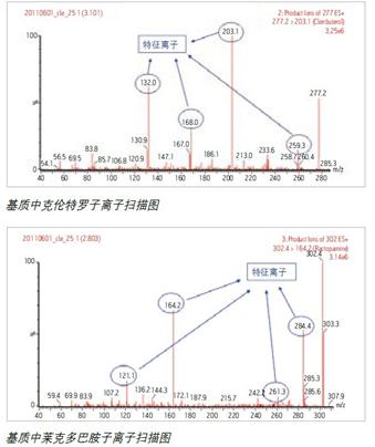 本方法才用一次進(jìn)樣同時(shí)監(jiān)測(cè)豬尿液樣品中的 21 種 β- 受體激動(dòng)劑進(jìn)行檢測(cè),在靈敏度、分離度方面獲得滿意的結(jié)果。與常規(guī)的串聯(lián)四極桿質(zhì)譜儀不同的是, Xevo TQ-S 為您提供最好的定量數(shù)據(jù)的同時(shí),還為您提供高質(zhì)量的光 MS/MS 信息。對(duì)豬尿液中含 0.5ug/L 的受體激動(dòng)劑樣品,啟用 PICs (子離子確認(rèn)掃描)功能,可在不影響 MRM 定量的同時(shí)得到各化合物子離子掃描圖,與標(biāo)樣子離子圖進(jìn)行匹配,對(duì)樣品中陽(yáng)性結(jié)果定性起到幫助判斷的作用。