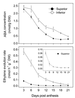 Fig 3. Levels of ABA content and ethylene evolution rate in the superior and inferior spikelets during grain filling of rice.