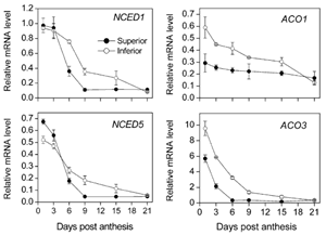 Fig 2. Changes in the expression profiles of ABA synthesis genes NCED1 and NCED5 and the ethylene synthesis genes ACO1 and ACO3 in superior and inferior spikelets during grain filling of rice.