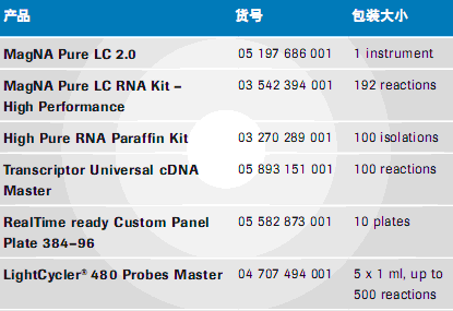 使用MagNA Pure LC 儀、MagNA Pure LC RNA Kit –High Perfor-mance(Roche,貨號:03 542 394 001),與MagNA Pure LC 程序“RNA HP Cells”從細(xì)胞小球中分離總體細(xì)胞 RNA。溶解并混合細(xì)胞裂解物(1 x 106細(xì)胞每 600 µl RLT 緩沖液[Qiagen,貨號:79216]),并將 2 x 200 µl細(xì)胞裂解物轉(zhuǎn)移至MagNA Pure Sample Cartridge wells(200 µl每孔)。洗脫裂解液重復(fù)分離制備的 RNA 至 50 µl,并收集洗脫液。FFPE 組織 RNA 分離使用 High Pure RNA Paraffin 試劑盒(Roche,貨號: 03 270 289 001),根據(jù)操作手冊(福爾馬林固定、石蠟包埋組織 RNA 分離方案),從10um FFPET 切片中分離總體細(xì)胞 RNA, 經(jīng)過調(diào)整的技術(shù)操作步驟如下:1 x 蛋白酶 K 85°C 消化 30 分鐘;第二次添加蛋白酶 K 55°C 消化 30 分鐘;室溫 High Pure 柱上DNase處理 15 分鐘。經(jīng)過調(diào)整的技術(shù)操作步驟更加快速、上機(jī)時(shí)間更短,顯示其性能具有可比性。